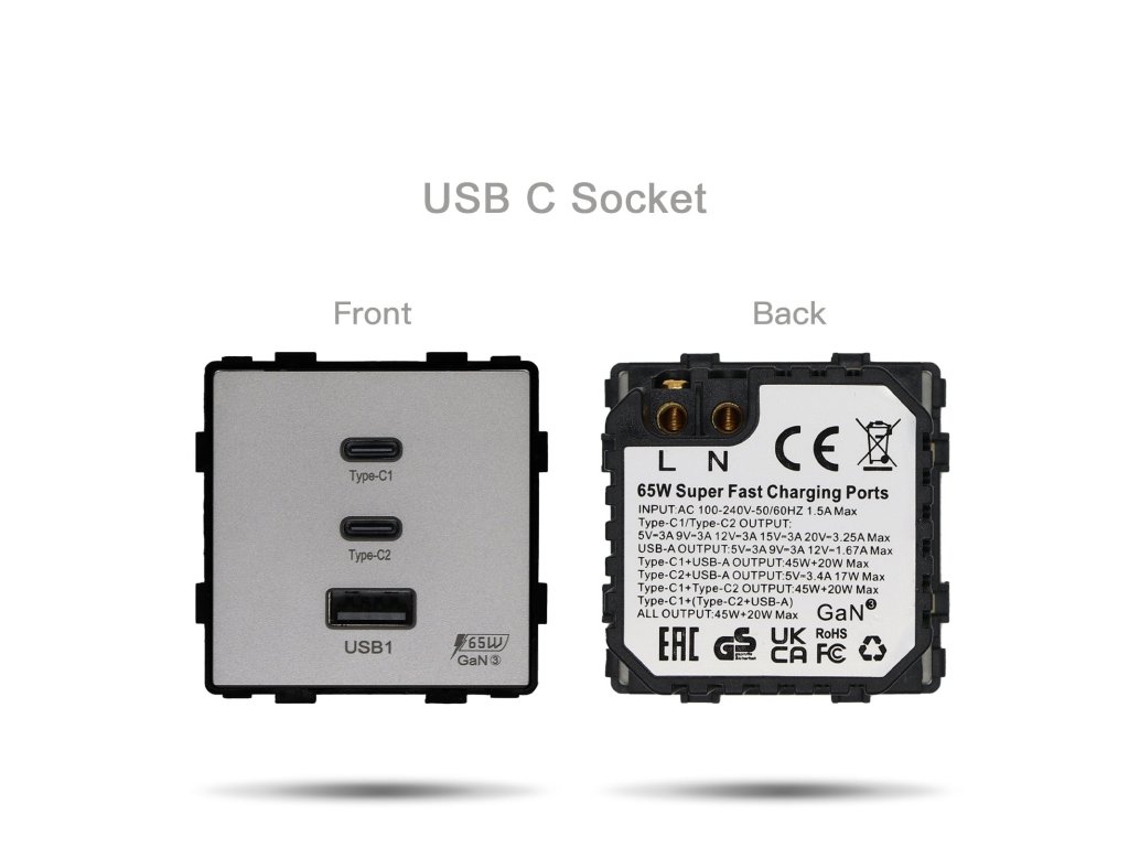 Zásuvka 65 W do zdi: vybavena dvěma porty Type-C (Type-C1 a Type-C2) a jedním portem Type-A (USB1).