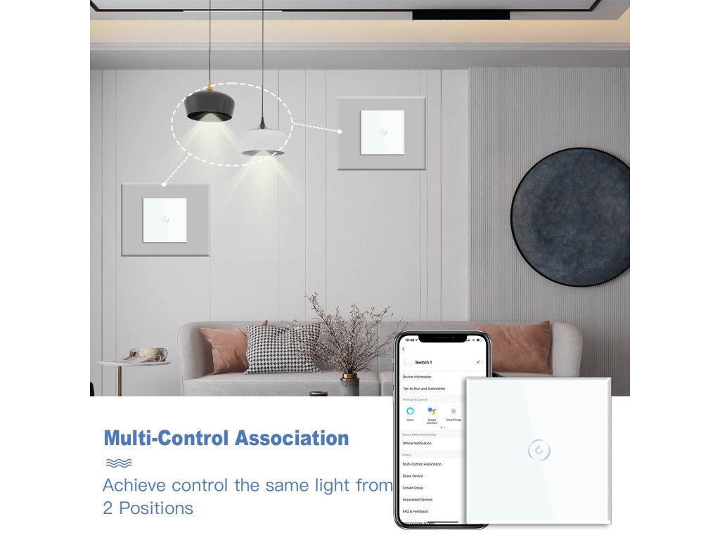 Více způsobové ovládání, wifi spínače mají 1/2/3/4 cesty a mohou ovládat jedno světlo ze čtyř různých míst (max. 4).