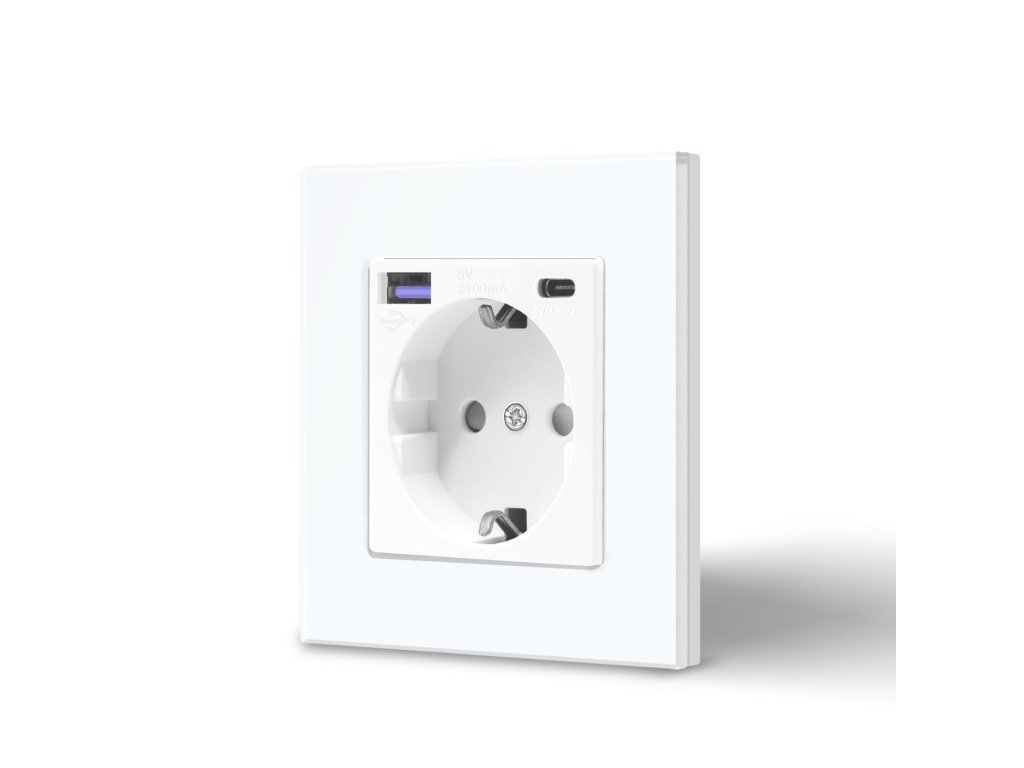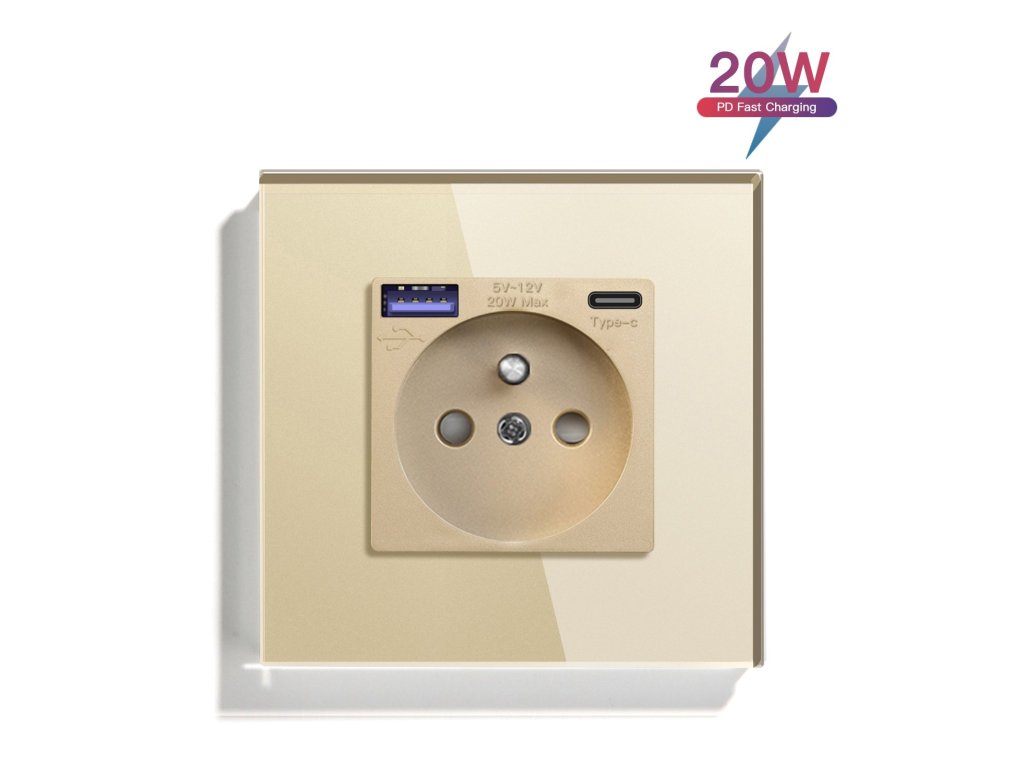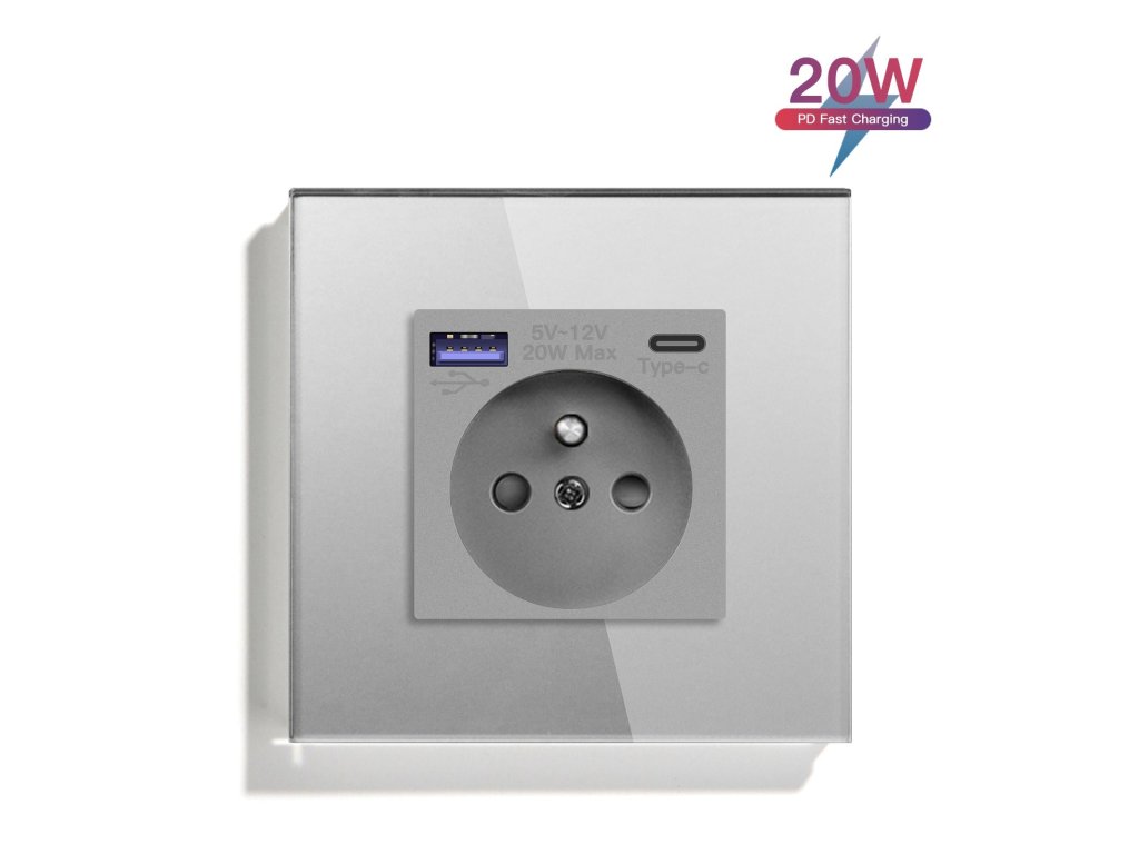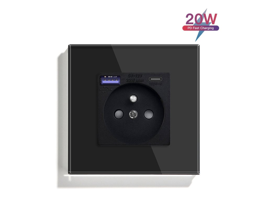 Skleněný panel 20W PD Fast Charge zásuvka na stěnu + USB typ C + Standard USB 3.0 FR.