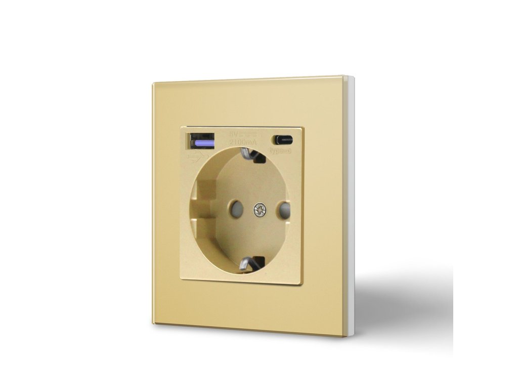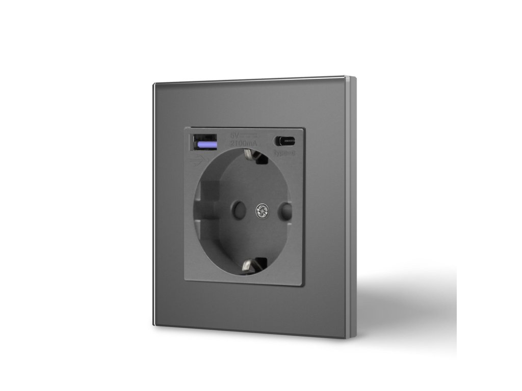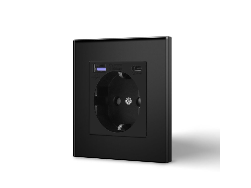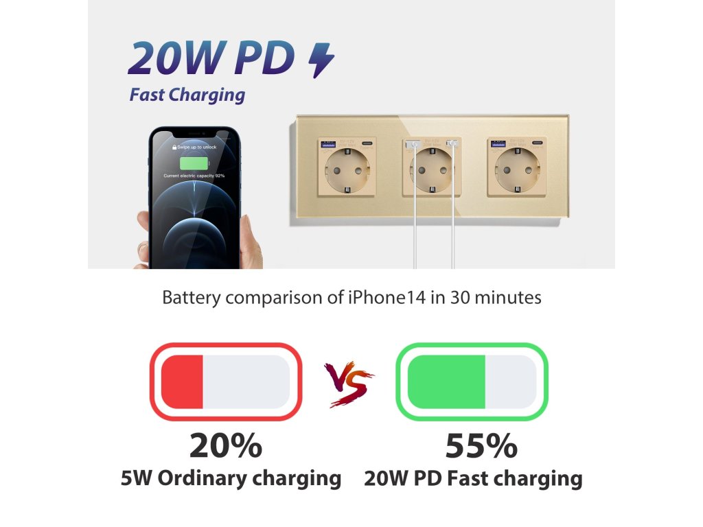 Skleněný panel 20W PD Fast Charge zásuvka na stěnu + USB typ C + Standard USB 3.0 FR.